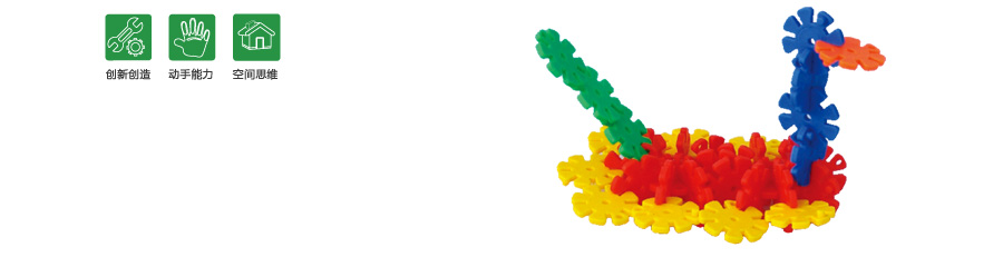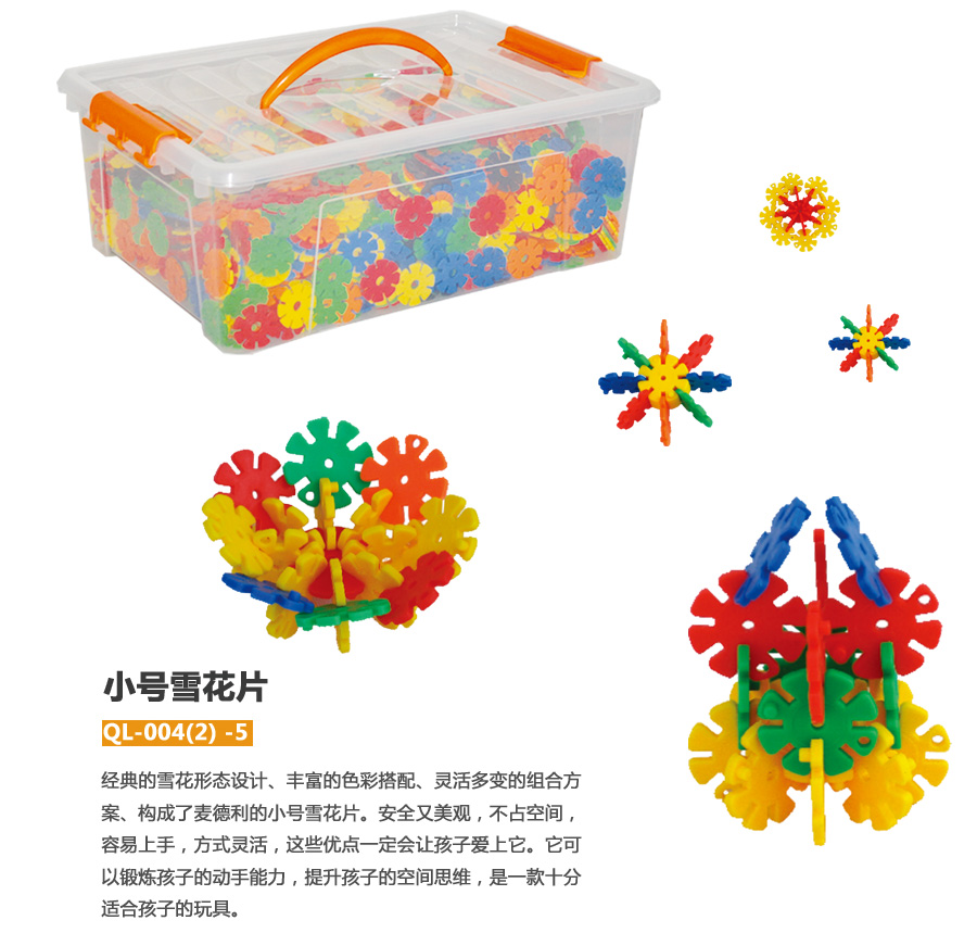 經典的雪花形態設計、豐富的色彩搭配、靈活多變的組合方案、構成了麥德利的小號雪花片。