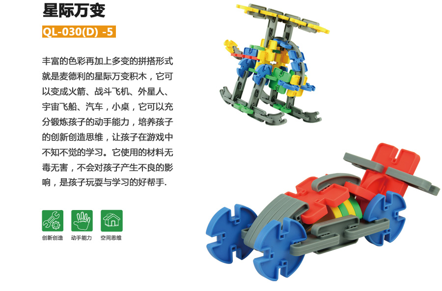 富的色彩再加上多變的拼搭形式就是麥德利的星際萬變積木,它可以變成火箭、戰斗飛機、外星人、宇宙飛船、汽車,小桌。